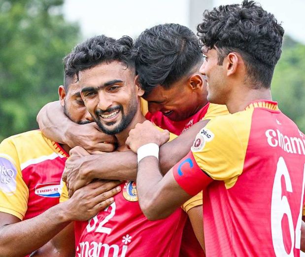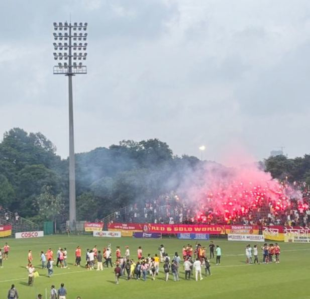 ইস্টবেঙ্গলকে এ দিন ড্র করলেই চলত। তবে ইউনাইটেডের বিরুদ্ধে ড্র করার চিন্তা মাথায় নিয়ে নামেইনি ইস্টবেঙ্গল। শুরু থেকেই ভাল খেলতে থাকে। আগ্রাসী খেলতে থাকেন লাল-হলুদ ফুটবলারেরা। গোল পেতে অবশ্য অপেক্ষা করতে হয়েছে। শেষ পর্যন্ত ডেভিড লালানসাঙ্গা প্রথমার্ধে এগিয়ে দেন ইস্টবেঙ্গলকে। তার মাঝে একের পর এক সুযোগ নষ্ট করেছেন ইস্টবেঙ্গলের ডেভিড, সায়ন বন্দ্যোপাধ্যায়েরা। ইউনাইটেডের গোলকিপার অঙ্কন ভাল কিছু সেভ করেন। দেবীপক্ষের শুরুতেই ট্রফি ঢুকল লাল হলুদ তাঁবুতে। এক মিনিটের ব্যবধানে জোড়া গোল। সাত গোলে জেতার ম্যাচে কষ্টার্জিত জয় ইস্টবেঙ্গলের। একদিনে জোড়া ট্রফি। পরপর দু’বার চ্যাম্পিয়ন ইস্টবেঙ্গল। আগের মরশুমের ট্রফি পাওয়ার দিনই আরও একবার কলকাতা লিগ জয় লাল হলুদের। ইউনাইটেড কলকাতা ক্লাবকে ২-১ গোলে হারিয়ে ঘরের মাঠে সমর্থকদের উপস্থিতিতে ৪১তম ঘরোয়া লিগ জিতল বিনো জর্জের দল। ময়দানে প্রিয় দলের জয় দেখতে মাঠ ভরায় সমর্থকরা। সপ্তাহের প্রথম দিন হলেও হাজার দশেক সাপোর্টার হাজির ছিল। চ্যাম্পিয়ন হওয়া শুধুই সময়ের অপেক্ষা ছিল। ইউনাইটেড কলকাতা স্পোর্টস ক্লাব এবং ডায়মন্ড হারবারের বিরুদ্ধে জয়ের পর এদিন মাত্র এক পয়েন্ট প্রয়োজন ছিল ইস্টবেঙ্গলের। দুই ম্যাচে কলকাতার প্রধানের পয়েন্ট ছিল ৬। সেখানে ইউনাইটেডের পয়েন্ট ছিল ৪। অর্থাৎ চ্যাম্পিয়ন হওয়ার জন্য তাঁদের প্রয়োজন ছিল জয়। কিন্তু বিপক্ষের মাঠে প্রথমার্ধে পুরোপুরি কোণঠাসা। প্রথম ৪৫ মিনিটেই শেষ হয়ে যেতে পারত ম্যাচ। প্রায় হাফ ডজন গোলে এগিয়ে যেতে পারত ইস্টবেঙ্গল। হ্যাটট্রিক মিস করেন পিভি বিষ্ণু এবং সায়ন ব্যানার্জি।