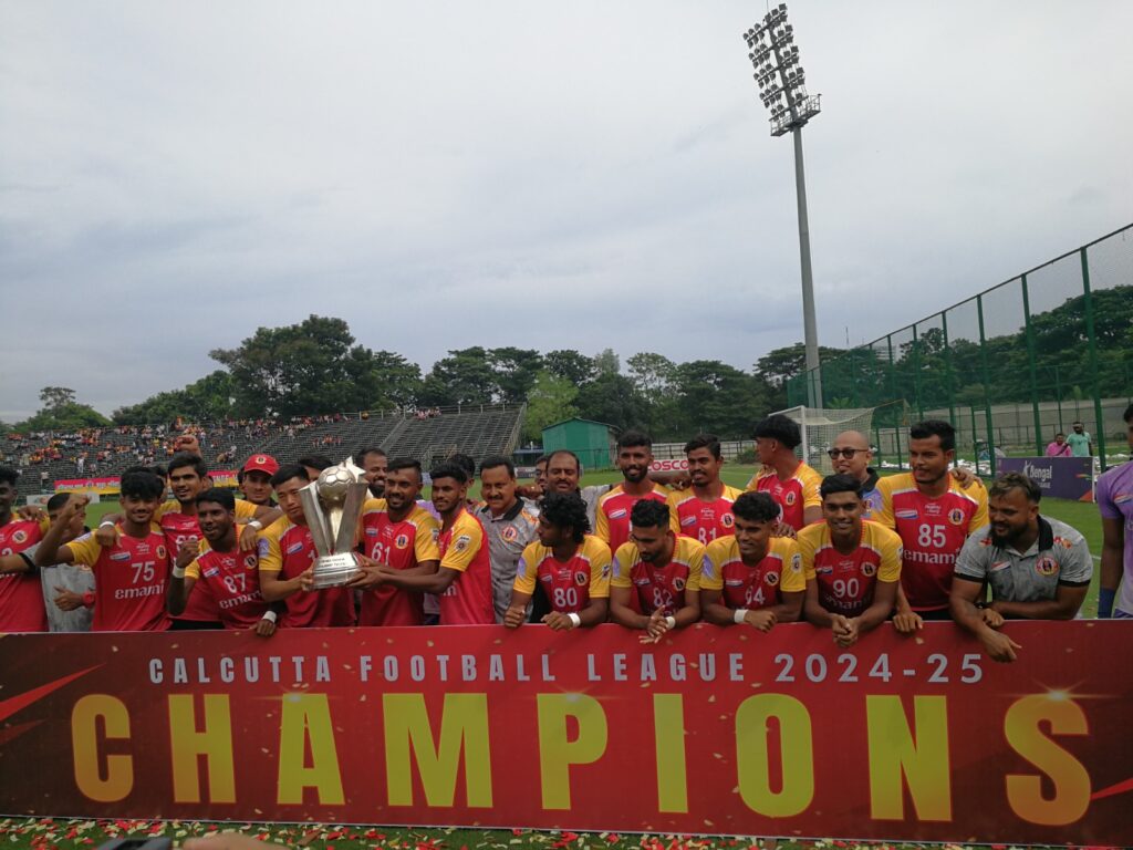 কলকাতা লিগ জিতল ইস্টবেঙ্গল। নিজেদের মাঠে চ্যাম্পিয়নশিপ রাউন্ডের শেষ ম্যাচে ইস্টবেঙ্গল ২-১ গোলে হারিয়ে দিল ইউনাইটেড স্পোর্টসকে। গত বার লিগ জেতার পর এ বার সেটা ধরে রাখল ইস্টবেঙ্গল। সব মিলিয়ে ৪১তম লিগ খেতাব জিতল। এ দিন লিগ জেতার জন্য ড্র করলেই চলত ইস্টবেঙ্গলের। তবে তিন পয়েন্ট নিয়ে অপরাজিত থেকেই লিগ জিতল। এ দিন ম্যাচ শুরু হওয়ার আগেই আইএফএ-র তরফে গত বারের কলকাতা লিগের ট্রফি তুলে দেওয়া হয় ইস্টবেঙ্গলের হাতে। কলকাতা পুরসভার মেয়র ফিরহাদ হাকিম ট্রফি তুলে দেন। কলকাতা হাই কোর্ট শুক্রবারই জানিয়েছিল, গত বারের লিগ চ্যাম্পিয়ন হিসাবে ইস্টবেঙ্গলের নাম ঘোষণা করতে বাধা নেই। শনিবার আইএফএ-র লিগ কমিটির বৈঠকের পর ইস্টবেঙ্গলকে আনুষ্ঠানিক ভাবে গত বারের লিগের চ্যাম্পিয়ন ঘোষণা করে দেওয়া হয়। শনিবারের পর সোমবার, অর্থাৎ তিন দিনের ব্যবধানে দু’বার কলকাতা লিগ জিতল ইস্টবেঙ্গল।