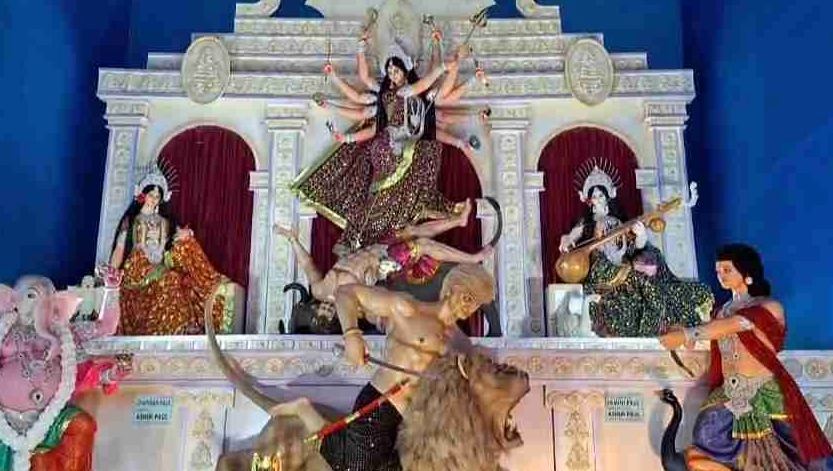 শারদ উৎসবের ঢাকে কাঠি পড়ে গিয়েছে। রবিবার সকালে দেবীর বোধন। তার আগে থেকেই রাজ্য জুড়ে একাধিক পুজো মণ্ডপের উদ্বোধন হয়ে গিয়েছে। দলে দলে মানুষ সেখানে ভিড় জমাচ্ছেন প্রতিমা দেখার জন্য। থিম থেকে শুরু করে সাবেকি ভাবনা, নানা চমক নিয়ে বিভিন্ন দুর্গাপুজো কমিটিগুলোর মধ্যে একে অন্যকে টেক্কা দেওয়ার প্রতিযোগিতা চলছে। ৫৯ তম বর্ষে মুর্শিদাবাদের বহরমপুর শহরে খাগড়া শ্মশানঘাট দুর্গাপুজো কমিটির প্রতিমা এমন চমক দিয়েছে যা জেলা বা রাজ্যের গণ্ডি ছাড়িয়ে বিদেশেও আলোচনার বিষয় হয়ে দাঁড়িয়েছে। এবছর এই ক্লাবের দুর্গা প্রতিমা দেখতে এসে সকলের চোখ দুর্গা প্রতিমার পরিবর্তে প্রথমেই গিয়ে পড়ছে দেবীর পায়ের কাছে থাকা দুই অসুরের দিকে। শুনতে অবাক লাগলেও বহরমপুরের এই দুর্গাপুজোর মূল আকর্ষণ হয়ে দাঁড়িয়েছে এক অসুর। আর সেই অসুরকে দেখতে পঞ্চমীর সকাল থেকে দলে দলে মানুষ ভিড় করছেন খাগড়া এলাকার এই প্রতিমা দেখার জন্য। মুর্শিদাবাদ জেলার অন্যতম বিখ্যাত প্রতিমা শিল্পী অসীম পালের হাতে এই পুজো কমিটির প্রতিমার মৃন্ময়ী মূর্তি তৈরি হয়েছে। বহরমপুর পুরসভার চেয়ারম্যান নাড়ুগোপাল মুখার্জির হাত ধরে এই পুজোর উদ্বোধন হওয়ার পর থেকেই খাগড়া শ্মশানঘাট দুর্গাপুজো কমিটির ‘বিশেষ’ অসুরের কথা ঝড়ের গতিতে ছড়িয়ে পড়ছে সমাজমাধ্যমে। সমাজমাধ্যমের মাধ্যমে সেই অসুরকে দেখেই প্রচুর লোক একবার চক্ষু-কর্ণের বিবাদভঞ্জন করার জন্যই মণ্ডপে আসছেন এই পুজোর অসুরকে চাক্ষুষ করতে। ৫৯ তম বর্ষে খাগড়া শ্মশানঘাট দুর্গাপূজা কমিটি যে প্রতিমা নির্মাণ করেছেন তা সাবেকি ধাঁচের। দেবী উমার সঙ্গে উপরের ধাপে রয়েছেন তাঁর দুই কন্যা, লক্ষী এবং সরস্বতী। নিচের ধাপে রয়েছেন কার্তিক এবং গণেশ। দেবী দুর্গার পায়ের কাছে দু’জন অসুরকে দেখতে পাওয়া যাচ্ছে। তার মধ্যে একজন দেবীর পায়ের কাছে পড়ে রয়েছেন। অন্যজন সিংহের পিঠে চেপে দেব সেনাপতি কার্তিকের সঙ্গে যুদ্ধরত অবস্থায় রয়েছেন। আর এই অসুরের মুখের সঙ্গে অনেকেই মিল খুঁজে পাচ্ছেন আমেরিকার প্রেসিডেন্ট ডোনাল্ড ট্রাম্পের। আর ‘ট্রাম্পরূপী’ এই অসুরকে একবার সচক্ষে দেখার জন্য এবং নিজেদের মোবাইল ফোনের ক্যামেরায় বন্দি করার জন্য ভিড় জমছে এই পুজো প্যান্ডেলে। ভারতীয় পুরাণ মতে অসুরেরা সবসময় দেবতাদের সঙ্গে যুদ্ধ করে। মহিষাসুরের আগে দেবী দুর্গার হাতে মধু ও কৈটভ নামে দুই অসুর বধ হয়েছিলেন। ভগবত পুরাণ অনুসারে বিষ্ণুর দুই কানের ময়লা থেকে এই দুই অসুরের জন্ম। অত্যন্ত উচ্চাকাঙ্ক্ষী ও অত্যাচারী মধু ও কৈটভ, ব্রহ্মার থেকে বেদ হরণ করেছিলেন বলে বলা হয়। পুরাণ মতে, এদের সঙ্গে কয়েক হাজার বছর ধরে যুদ্ধ করেও স্বয়ং বিষ্ণু তাঁদের পরাজিত করতে পারেননি। তখন আদ্যাশক্তি 