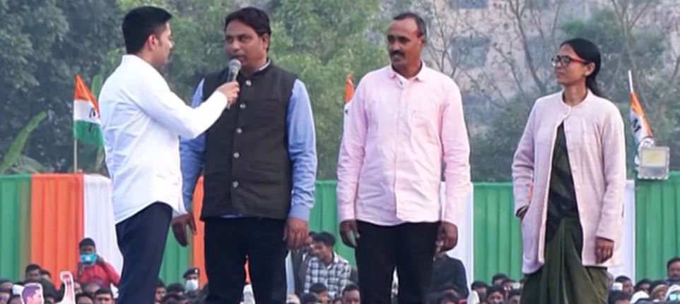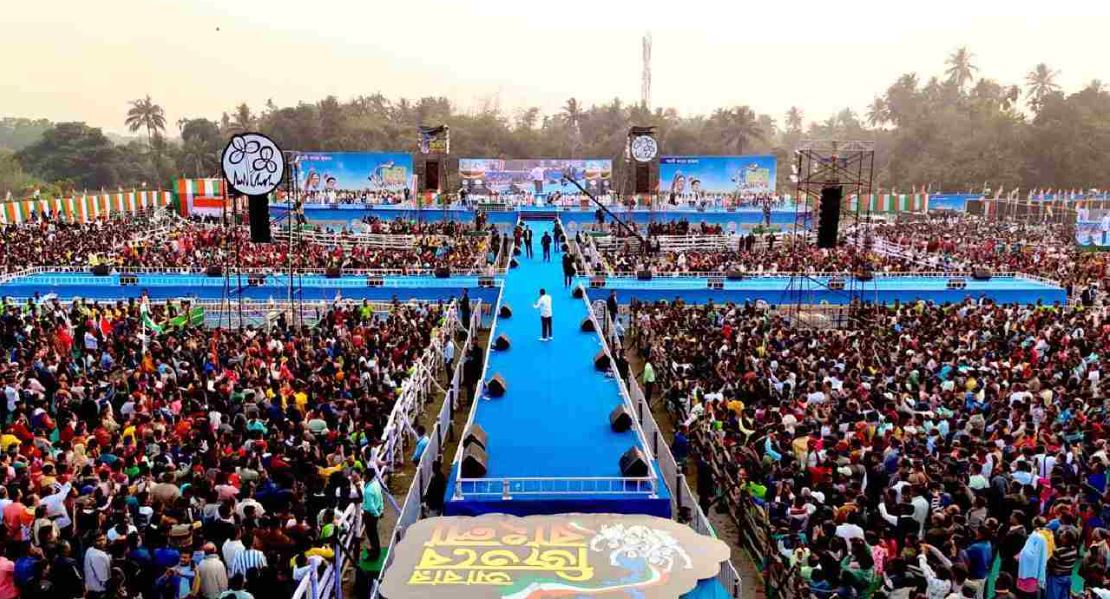 ২০২৪ সালে লোকসভা নির্বাচনের আগে ব্রিগেডে তৃণমূল যে জনসভা করেছিল সেই মঞ্চের আদলেই এবার তৈরি হচ্ছে অভিষেকের জনসভার মঞ্চ। লোকসভা নির্বাচনের আগে ব্রিগেডে এই একই ধরনের মঞ্চে লম্বা ব়্যাম্প ধরে হেঁটে কর্মীদের কাছে পৌঁছে গিয়েছিলেন অভিষেক এবং মমতা। অভিষেক সভামঞ্চে ডাকলেন এমন তিনজনকে, যাঁরা নির্বাচন কমিশনের তালিকায় ‘মৃত’, তেমনটাই অভিযোগ অভিষেকের। বক্তৃতার মাঝেই তিনি মঞ্চে ডেকে নেন মেটিয়াবুরুজের মনিরুল মোল্লা, মায়া দাস এবং কাকদ্বীপের হরেকৃষ্ণ গিরিকে। অভিষেক বললেন, বেঁচে রয়েছেন, কিন্তু নির্বাচন কমিশনের তালিকায় মৃত, দক্ষিণ চব্বিশ পরগণায় এই সংখ্যা ২৪। বেশ বড় অংশ জুড়ে দক্ষিণ চব্বিশ পরগনা নিয়ে কথা বলেন অভিষেক। জানান, কেন তাঁর এই সভা শুরু হল দক্ষিণ চব্বিশ পরগনা থেকেই। নিজের ‘কর্মভূমি’ত্রে দাঁড়িয়েই ২৬-এর ভোটের সুর বেঁধে দিলেন তৃণমূলের সর্বভারতীয় সাধারণ সম্পাদক। এদিন তিনি বলেন, ‘আমি কথা দিয়েছি, ২০২১-এর চেয়ে তৃণমূলের ভোট ২০২৬-এ বাড়বে। একটা হলেও আসন বাড়বে।