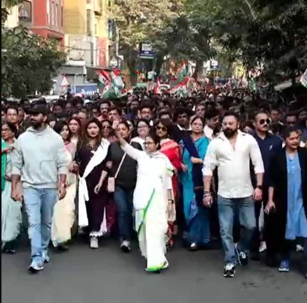 যাদবপুর ৮বি বাসস্ট্যান্ড থেকে শুক্রবার দুপুরে মিছিল শুরু মমতা বন্দ্যোপাধ্যায়ের। পাশে রয়েছেন রাজ্যের মন্ত্রী ফিরহাদ হাকিম, অরূপ বিশ্বাস, দেব, সোহম-সহ তৃণমূলের অন্য সাংসদ, বিধায়কেরা। রয়েছেন টেলি-তারকারাও। মিছিল শুরুর আগে ৮বি বাসস্ট্যান্ডে দাঁড়িয়ে মমতা জানান, দিল্লির বঞ্চনা, লাঞ্ছনার বিরুদ্ধে, এ রাজ্যের মানুষের অধিকার কেড়ে নেওয়ার বিরুদ্ধে ‘রাস্তাই রাস্তা’। বিকেল সাড়ে ৪টে নাগাদ হাজরায় শেষ হয় মিছিল। যাদবপুরের ৮বি বাসস্ট্যান্ড থেকে বিকেল ৩টে নাগাদ মিছিল শুরু করেন মুখ্যমন্ত্রী। গন্তব্য হাজরা মোড়। মমতার সঙ্গে রয়েছেন রাজ্যের শাসকদলের নেতা-মন্ত্রী, বিধায়ক, সাংসদ থেকে বিশিষ্টজন এবং সাধারণ মানুষ। মিছিল শুরু করার আগে যাদবপুরে দাঁড়িয়ে মুখ্যমন্ত্রী বলেন, ‘‘এই অঞ্চলের সকল নাগরিকবৃন্দকে, মা-মাটি-মানুষকে প্রণাম, ধন্যবাদ, কৃতজ্ঞতা জানাচ্ছি। সকলকে নতুন বছরের শুভেচ্ছা জানাই। আপনাদের সমর্থন বাংলার মানুষকে সারা বিশ্বের দরবারে এগিয়ে নিয়ে যাবে।’’ তার পরেই তিনি জানিয়ে দেন, শুক্রবারের এই কর্মসূচির উদ্দেশ্য। তাঁর কথায়, ‘‘দিল্লির বঞ্চনা, লাঞ্ছনা, অত্যাচার, অপমান, অসম্মান, ২ কোটি মানুষের ভোট কেটে দেওয়া হচ্ছে, অধিকার কেড়ে নেওয়া হচ্ছে— তার বিরুদ্ধে রাস্তাই আমাদের রাস্তা। এটা নেতাজির কথা।’’ তিনি এ-ও বলেন, ‘‘যাদবপুরের মাটি লড়াইয়ের মাটি। উদ্বাস্তুদের মাটি।’’ মিছিল শুরু করেন মুখ্যমন্ত্রী। তাঁর এক পাশে তৃণমূল সাংসদ দেব, অন্য পাশে তৃণমূল বিধায়ক সোহম, রাজ্যের মন্ত্রী ফিরহাদ, অরূপ। পিছনের সারিতে দলের নেতা-নেত্রী, টেলিতারকারা। রাস্তার দু’পাশে মানুষের জমায়েত।