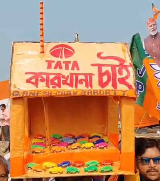 ‘সিঙ্গুরে কারখানা চাই’। ভোটমুখী পশ্চিমবঙ্গে আওয়াজ। টাটার কারখানা না-হওয়া থেকে শুরু করে পশ্চিমবঙ্গে শিল্পায়নের প্রসঙ্গ তুলে রাজ্য সরকার তথা মমতার কড়া সমালোচনা। রবি দুপুরে ‘টাটার মাঠ’-এ (টাটার ন্যানো কারখানা তৈরি না হলেও স্থানীয়দের মুখে তা এখনও ‘টাটার মাঠ’ নামেই পরিচিত) সভা মোদীর। বিজেপির ‘পরিবর্তন সংকল্প সভা’ ঘিরে দলীয় কর্মী-সমর্থকদের উচ্ছ্বাস চোখে পড়ার মতো। আপাদমস্তক গেরুয়া রঙ মেখে হাজির হয়েছেন বিজেপির এক কর্মী। গায়ে গেরুয়া রঙের উপরে লেখা ‘সিঙ্গুরে কারখানা চাই’। গঙ্গা পেরোনোর পর থেকে সিঙ্গুর পর্যন্ত গোটা রাস্তা সাজানো হয়েছে মোদী, নড্ডাদের ছবি দিয়ে। সঙ্গে রয়েছে রাজ‍্য বিজেপির চার ‘এস’-এর ছবিও। রাজ্য সভাপতি শমীক ভট্টাচার্য, বিরোধী দলনেতা শুভেন্দু অধিকারী এবং দুই কেন্দ্রীয় মন্ত্রী সুকান্ত মজুমদার ও শান্তনু ঠাকুরের ছবি সাজানো হয়েছে রাস্তার ধার দিয়ে।