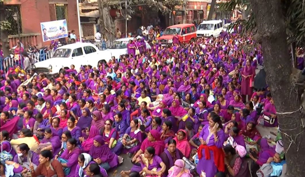 বেগুনি শাড়ির মিছিলে স্তব্ধ নগরী!‌ সরকারি কর্মীদের মতো সব ধরনের অধিকারের ‘‌আশায়’‌ লড়াই আশাকর্মীদের