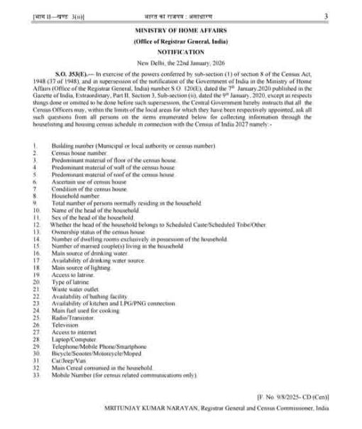 দীর্ঘ ১৪ বছর পরে ১ এপ্রিল থেকে শুরু হবে দেশের ষোড়শ জনগণনা (২০২৭)-এর প্রথম পর্যায়। তার জন্য ৩৩টি প্রশ্নের তালিকা প্রকাশ করেছে কেন্দ্র। সেই তালিকায় রয়েছে মোবাইল, ল্যাপটপ, ইন্টারনেট থেকে সাইকেল-বাইক সম্পর্কিত প্রশ্নও। মূলত কী ধরনের খাদ্যশস্য ঘরে আনা হয়, জানতে চাওয়া হবে তা নিয়েও। জ্বালানি থেকে পানীয় জলের পর্যাপ্ত সুবিধা আছে কি না, সেই সংক্রান্ত প্রশ্নও রয়েছে। জানা যাচ্ছে, জনগণনার সঙ্গে প্রয়োজনীয় তথ্য পেতে কর্মী ও তত্ত্বাবধায়ক নিয়োগ করে সকলকে নির্দিষ্ট দায়িত্ব দেওয়া হবে। এই কাজের জন্য সাহায্য নেওয়া হবে জেলা ও রাজ্য প্রশাসনের। মোট দু’টি ধাপে গণনা হবে। প্রথম পর্যায়ে মূলত বাড়ির তালিকা, তার অবস্থা ও প্রতিটি পরিবারের সম্পত্তি-সহ বিভিন্ন তথ্য নথিভুক্ত করা হবে। দ্বিতীয় পর্যায় শুরু হবে ২০২৭ সালের ১ ফেব্রুয়ারি থেকে। সেই ধাপে জনগণের আর্থ-সামাজিক অবস্থা, সংস্কৃতি-সহ বিভিন্ন তথ্য সংগ্রহ করা হবে। ষোড়শ জনগণনা হলেও স্বাধীনতার পর থেকে হিসাব করলে এই আদমশুমারির বয়স অষ্টম।