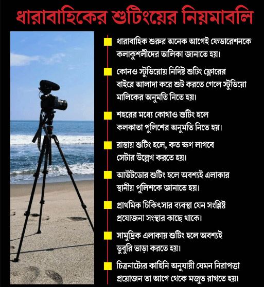 এক প্রযোজক বললেন, “পুলিশের অনুমতি তো নিতেই হয়। এমন কোনও এলাকায় শুটিং হচ্ছে, যে জায়গাটা কোনও পুরসভা বা কোনও ট্রাস্টি বোর্ডের অধীনে। সে ক্ষেত্রে তাদেরও অনুমতি নেওয়ার প্রয়োজন হয়। তবে ধারাবাহিকের ক্ষেত্রে এক মাস আগে থেকে তো সবকিছু তৈরি হয়ে থাকে না। অনেক সময় এমনও হয়, চিত্রনাট্য লেখা হয়েছে এক দিন আগে। পরের দিনই হয়তো আউটডোর শুটিংয়ে বেরিয়ে যেতে হবে। তখন অনেক সময় পুলিশকে বাড়তি কিছু টাকা দিয়ে বিশেষ অনুমতি করিয়ে নেওয়া হয়। আর যে লোকালয়ে শুটিং হচ্ছে সেখানে সাধারণ কিছু মানুষের সঙ্গে কথা বলে রেখে দিই, যাতে ভি়ড় সামলানো সহজ হয়। জলে শুটিং হলে দু’এক জন ডুবুরিকে অল্প পারিশ্রমিকে রাখা হয়।” ফেডারেশন সভাপতি স্বরূপ বিশ্বাস বলেন, “ধারাবাহিকের প্রযোজনা সংস্থার তরফে আমাদের শুধু জানানো হয় বাইরে শুটিং করতে যাওয়া হচ্ছে। এ বার কী চিত্রনাট্য, কোথায় শুটিং হবে সেটা সমুদ্রের মাঝে না পাহাড়ের চূড়ায়, সেটা জানানো হয় না। প্রযোজনা সংস্থারাই দাবি করে থাকে, এটা বাইরের কাউকে বলা সম্ভব নয়। এইটুকুও তো আগে আমাদের জানানো হত না। আমি অনেক চেঁচামেচি করে তার পর এখন জানায় আমাদের। এ ছাড়া আমাদের কোনও তথ্য জানানো হয় না। কোনও দিন কোনও উত্তর পাইনি। বলা হয়েছে চিত্রনাট্যের ব্যাপার। বাইরে জানানো হবে না। প্রশ্ন করলে তো ফেডারেশনকেই তোপ দেওয়া হয়। বলা হয় শেষ মুহূর্তে সব ঠিক হয়েছে, জানানো সম্ভব নয়। অবিশ্বাস্য সব যুক্তি খাড়া করা হয় এ সব প্রশ্ন তুললে।”