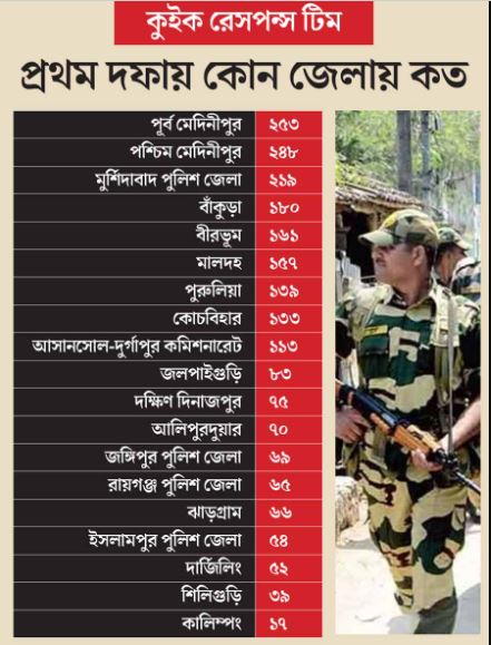 ‘কুইক রেসপন্স টিম’-এর গাড়িতে অবশ্যই ক্যামেরা থাকবে বলে জানিয়েছে কমিশন। এ ছাড়াও, দলের নেতৃত্বের কাছে সংশ্লিষ্ট বুথের নকশা থাকবে। কোথাও বুথ দখল বা কোনও অশান্তির অভিযোগ পেলেই নির্দিষ্ট জায়গায় পৌঁছে যাবে ‘কুইক রেসপন্স টিম’। নিয়মিত সেক্টর অফিস এবং কন্ট্রোল রুমের সঙ্গে যোগাযোগ রাখবে ।কমিশনের ঘোষণা অনুযায়ী, প্রথম দফায় সমগ্র উত্তরবঙ্গের জেলাগুলির ভোটগ্রহণ হয়ে যাবে। দার্জিলিং, কালিম্পং, জলপাইগুড়ি, আলিপুরদুয়ার, কোচবিহার, উত্তর এবং দক্ষিণ দিনাজপুর এবং মালদহ। পাশাপাশি জঙ্গলমহলেও প্রথম দফায় নির্বাচন রয়েছে। ঝাড়গ্রাম, পুরুলিয়া, বাঁকুড়ার পাশাপাশি বীরভূম, মুর্শিদাবাদে এই দফাতেই ভোট হবে। অন্য দিকে, পূর্ব ও পশ্চিম মেদিনীপুর এবং পশ্চিম বর্ধমানেও এই দফায় ভোটগ্রহণ হবে। এই ১৬টি জেলায় ভোটের দিন কোথায় কতগুলি ‘কুইক রেসপন্স টিম’ থাকবে, তা জানাল কমিশন। কমিশন জানিয়েছে, ২৩ এপ্রিল মুর্শিদাবাদ জেলায় মোট ২৮৮টি ‘কুইক রেসপন্স টিম’ থাকবে। তবে মুর্শিদাবাদকে দুই ভাগে ভাগ করে এই দল নিয়োগ করা হবে। প্রথমত, মুর্শিদাবাদ পুলিশ জেলা— সেখানে থাকবে ২১৯টি দল। আর জঙ্গিপুর পুলিশ জেলয় থাকবে ৬৯টি। তার পরেই রয়েছে শুভেন্দু অধিকারীর জেলা পূর্ব মেদিনীপুর। সেখানে ২৫৩টি ‘কুইক রেসপন্স টিম’ থাকবে। আর পশ্চিম মেদিনীপুরে থাকবে ২৪৮টি। কমিশনের দেওয়া তথ্য অনুযায়ী, ‘কুইক রেসপন্স টিম’ বাঁকুড়ায় থাকবে ১৮০টি, বীরভূমে ১৬১টি, মালদহে ১৫৭টি, পুরুলিয়ায় ১৩৯টি, কোচবিহারে ১৩৩টি, আসানসোল-দুর্গাপুর কমিশনারেটে ১১৩টি। বাকি জেলাগুলিতে ‘কুইক রেসপন্স টিম’-এর সংখ্যা ১০০-র নীচে। জলপাইগুড়িতে ৮৩টি ‘কুইক রেসপন্স টিম’ থাকবে বলে জানিয়েছে কমিশন। এ ছাড়াও, দক্ষিণ দিনাজপুরে ৭৫টি, আলিপুরদুয়ারে ৭০টি, ঝাড়গ্রামে ৬৬টি, দার্জিলিঙে ৫২টি, শিলিগুড়িতে ৩৯টি এবং কালিম্পঙে ১৭টি ‘কুইক রেসপন্স টিম’ দায়িত্বে থাকবে। উত্তর দিনাজপুর জেলাকেও মুর্শিদাবাদের মতো দুই পুলিশ জেলায় ভাগ করে ‘কুইক রেসপন্স টিম’ মোতায়েনের কথা জানিয়েছে কমিশন। এক, ইসলামপুর ও দুই, রায়গঞ্জ পুলিশ জেলা। এই দুই জায়গায় যথাক্রমে ৫৪ এবং ৭৫টি করে ‘কুইক রেসপন্স টিম’ থাকছে ভোটের দিনে।
