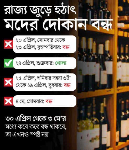 আকস্মিক এই সিদ্ধান্তে বিপাকে সুরাপ্রেমীরা হতাশ!‌ বাংলা জুড়ে সব মদের দোকান বন্ধ সোম থেকে!‌ প্রয়োজনীয় ব্যবস্থার কড়া নির্দেশ